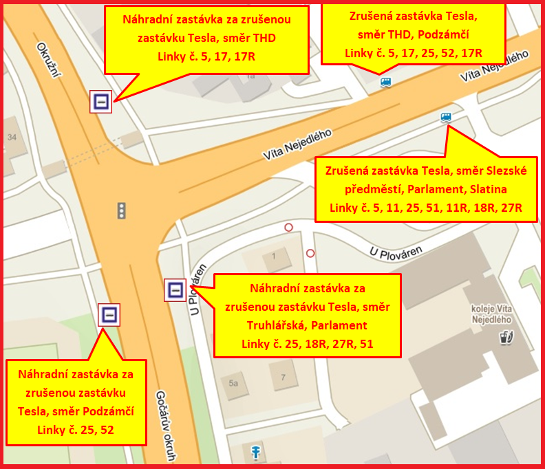 Pro linky č. 5, 17, 25, 52, 17R od 1. 6. 2019 do 28. 7. 2019 PŘEMÍSTĚNA na II. silniční okruh (viz mapa v příloze).