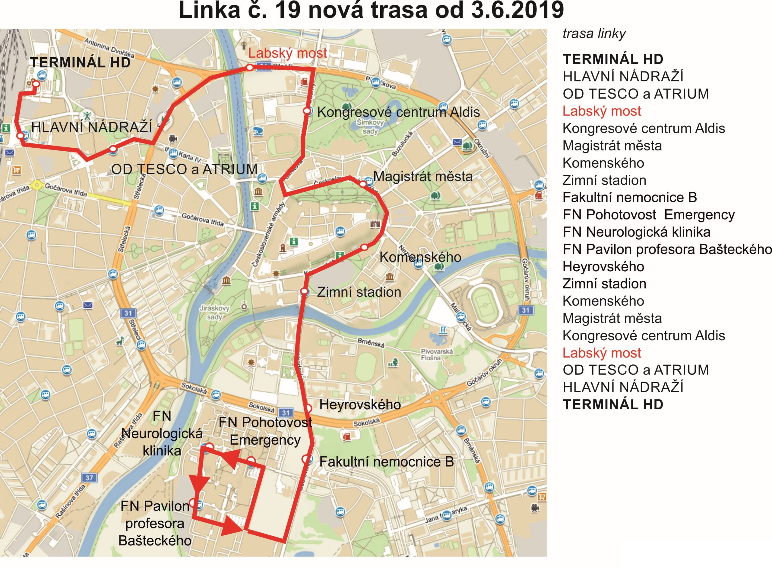 Linka, která dopravně obsluhuje Fakultní nemocnici, bude nově zajíždět na Terminál hromadné dopravy a bude obsluhovat novou zastávku Labský most (viz příloha).